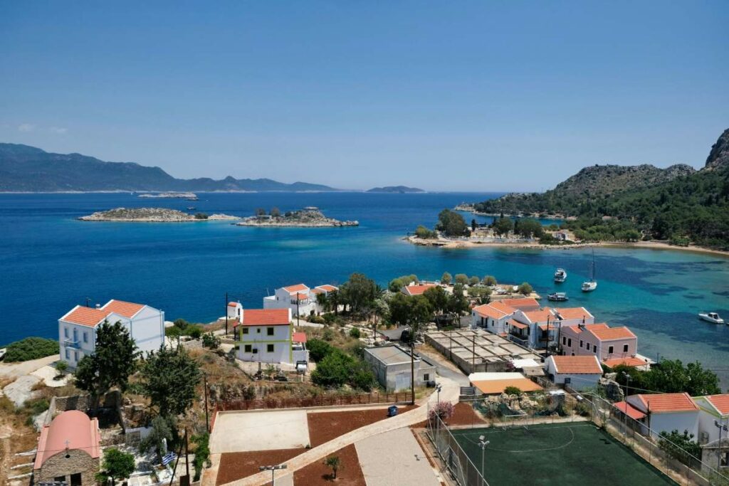 Al pasear por sus calles podrás apreciar una imagen muy distinta de la que solemos asociar a las islas griegas. Aquí, predominan casas altas y estrechas, pintadas en tonos ocres, rojos, amarillos y azules intensos, ofreciendo un paisaje urbano muy pintoresco, enmarcado por montañas áridas y un mar de tonos azules profundos. Durante el paseo, encontrarás iglesias, una mezquita y pequeñas plazas donde relajarte en Kastellorizo, en Grecia.